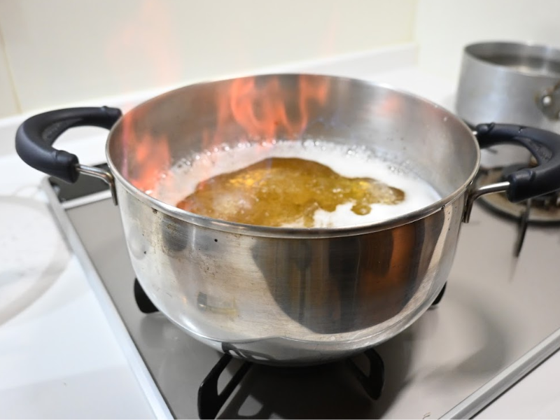 沸いてきたらチャッカマンなどで火をつけ、弱火にして約1分。やけどに注意!